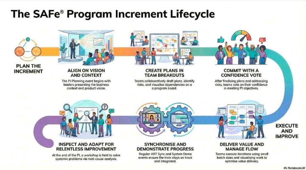 In the context of business agility, the Scaled Agile Framework (SAFe) management involves synchronising alignment, collaboration, and delivery for multiple agile teams.