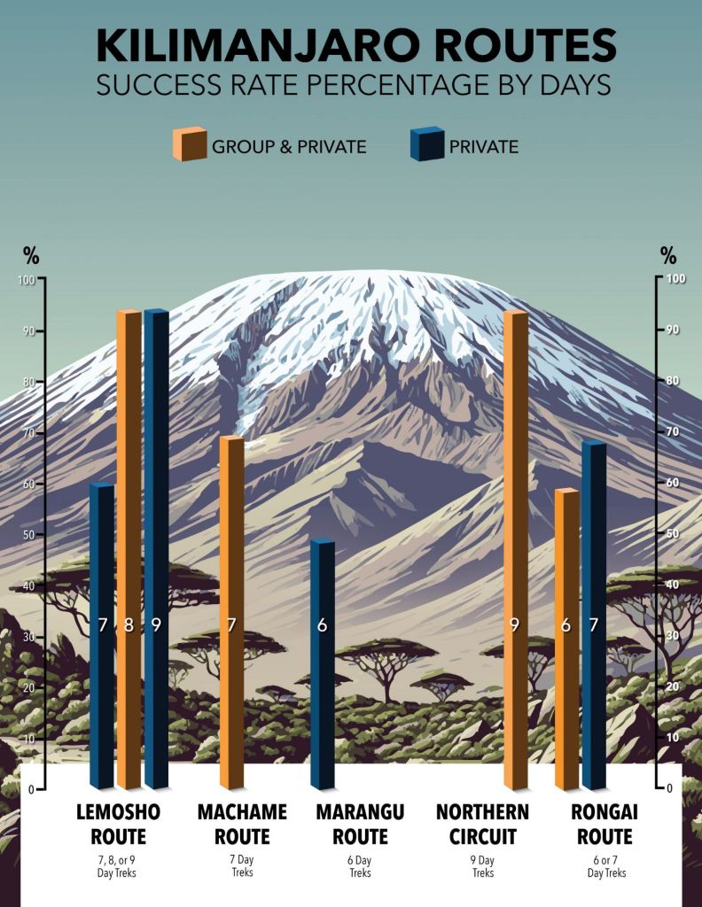 Lemosho 7–8 Days High success rate; beautiful scenery.