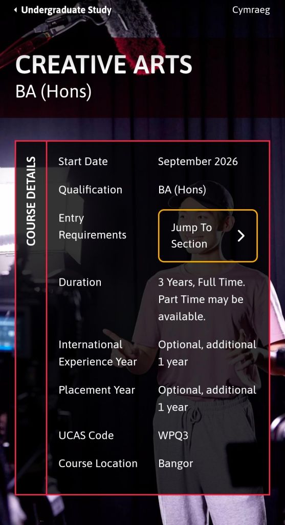 The Creative Arts BA (Hons) at Bangor University is a three-year, full-time course (UCAS code: WPQ3) that integrates film, media, journalism, and creative writing. It is designed to balance theoretical study with practical, hands-on production.