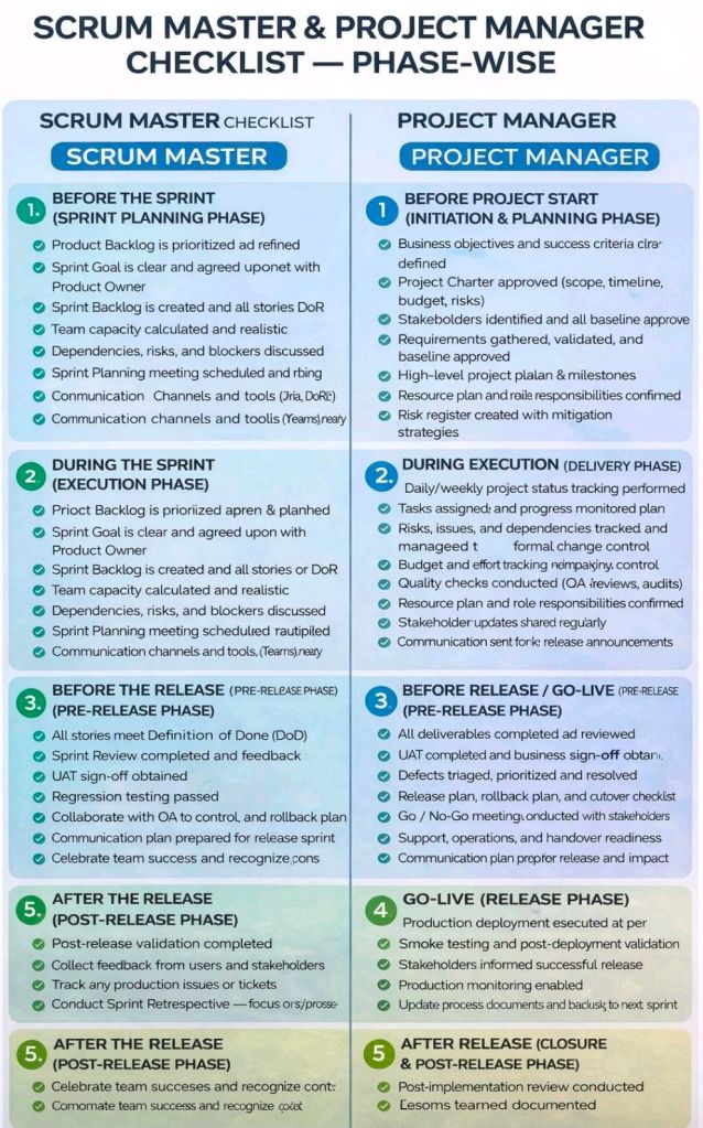 Project Phases, Scrum Master & Project Manager Checklist