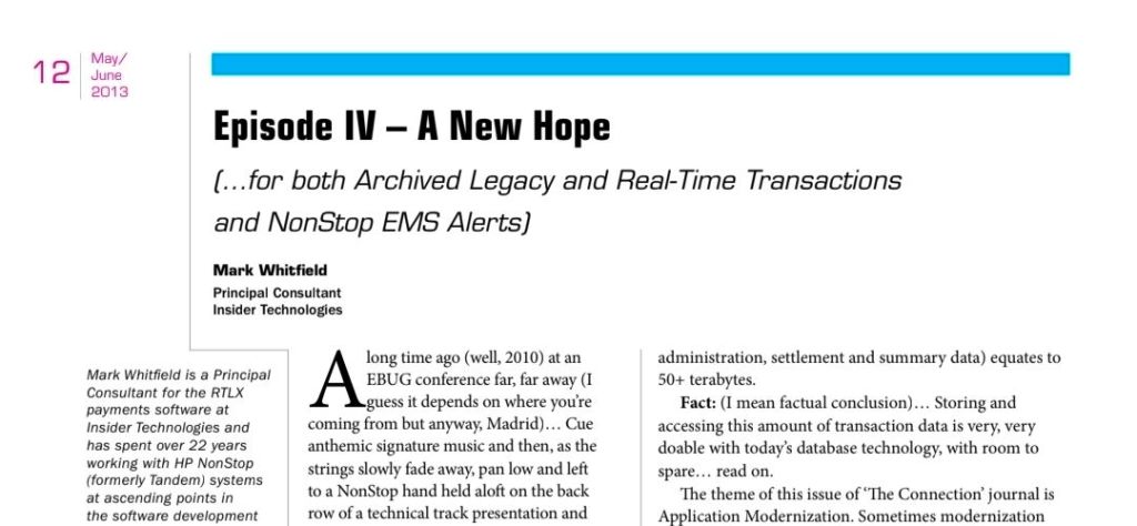 - 2013: Published work in the HP NonStop journal “The Connection”.