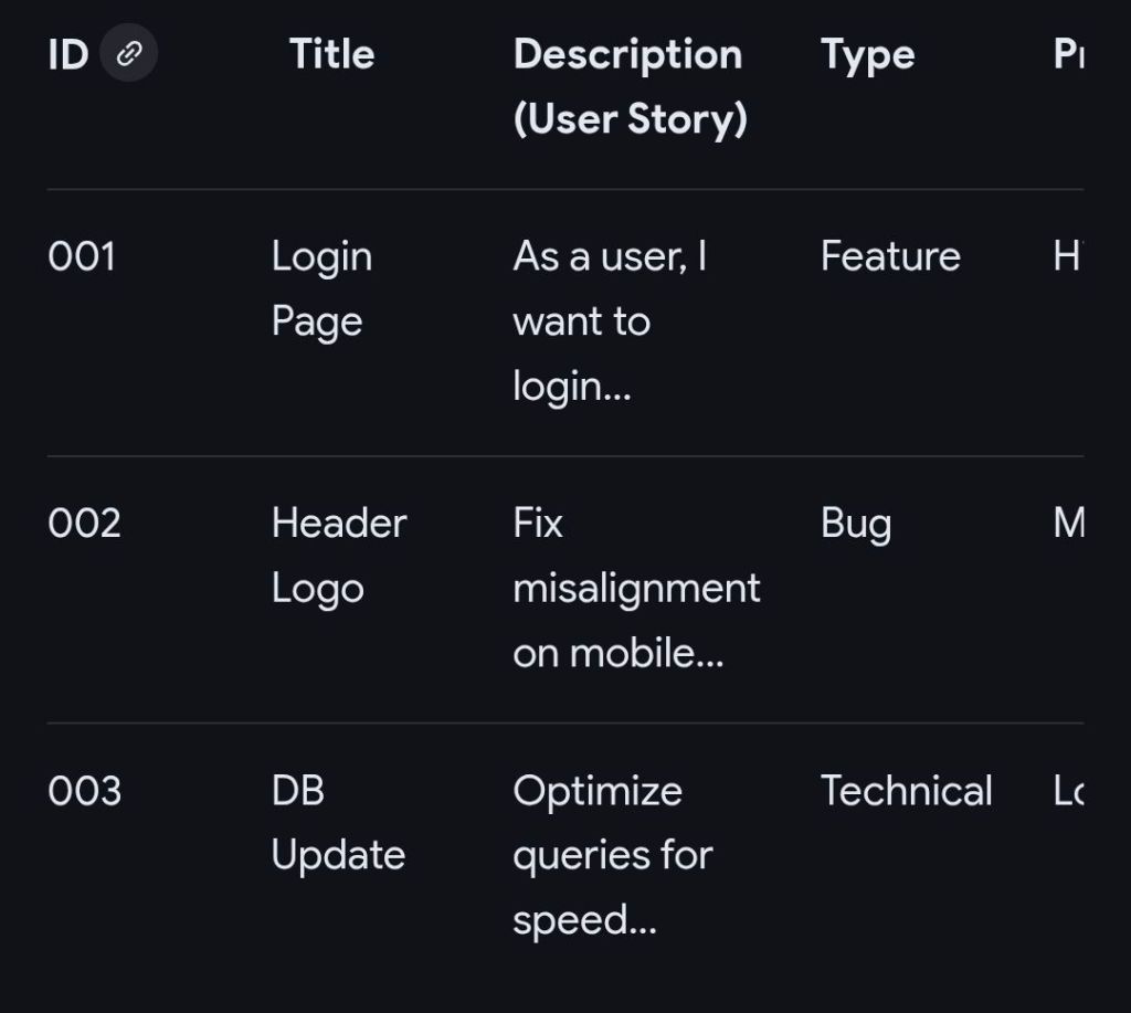 - Kanban Board View: Organizes the backlog into vertical columns representing stages of workflow (Backlog, In Progress, Done).