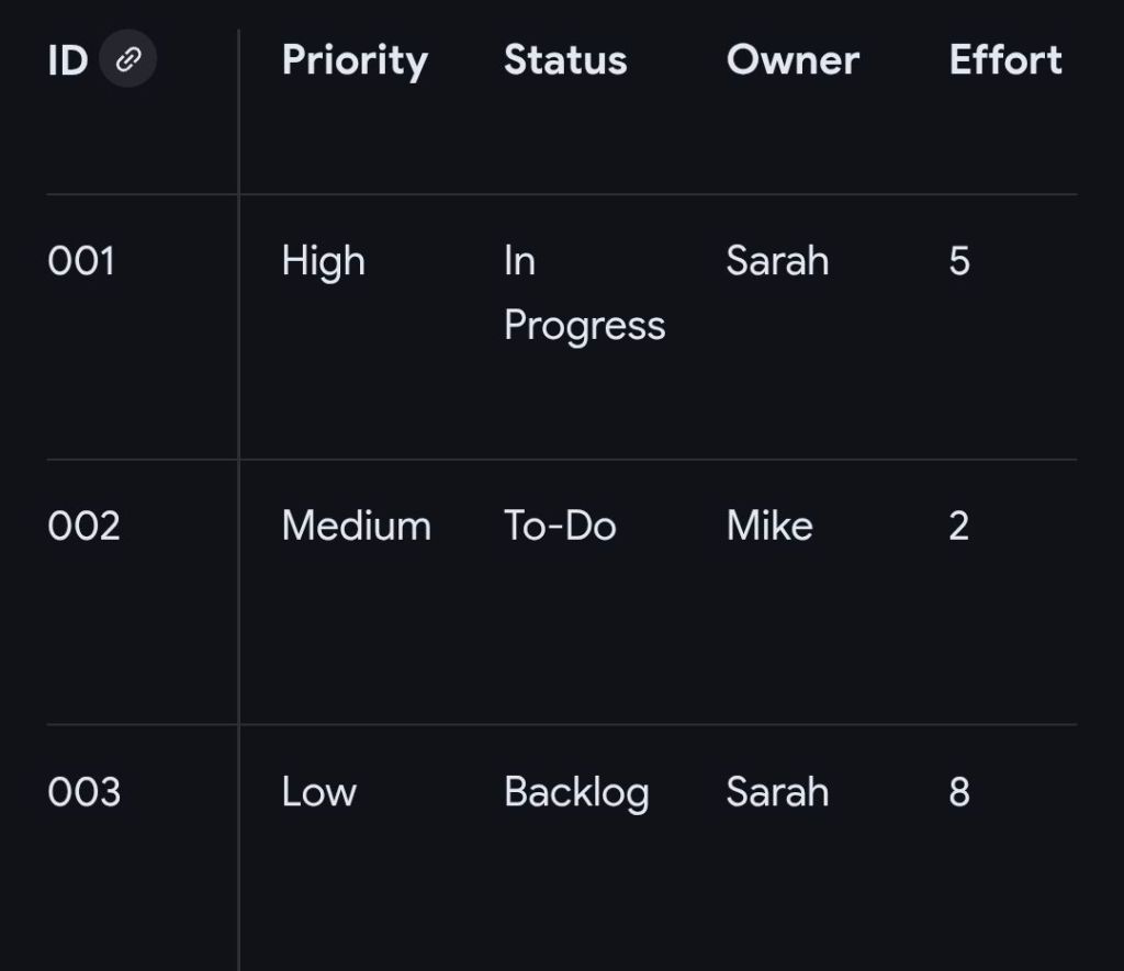 - Priority: Categorisation of importance (High, Medium, Low) to help teams focus on critical items.