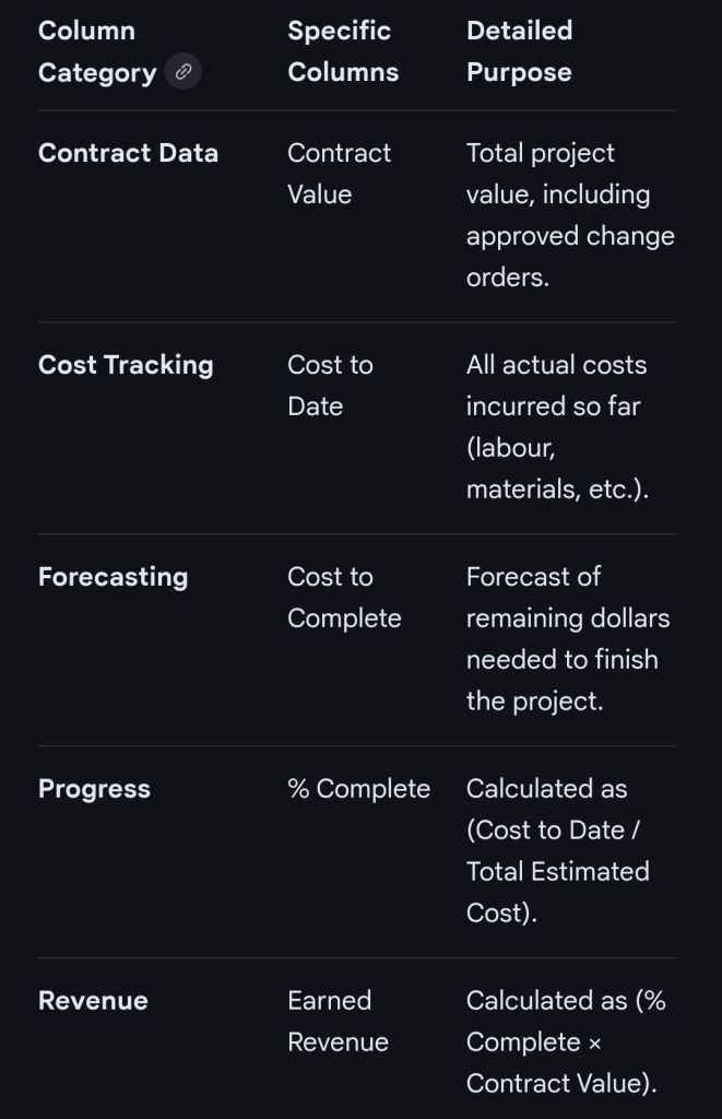 2. Essential Columns for Financial WIP (Construction/Contracting)