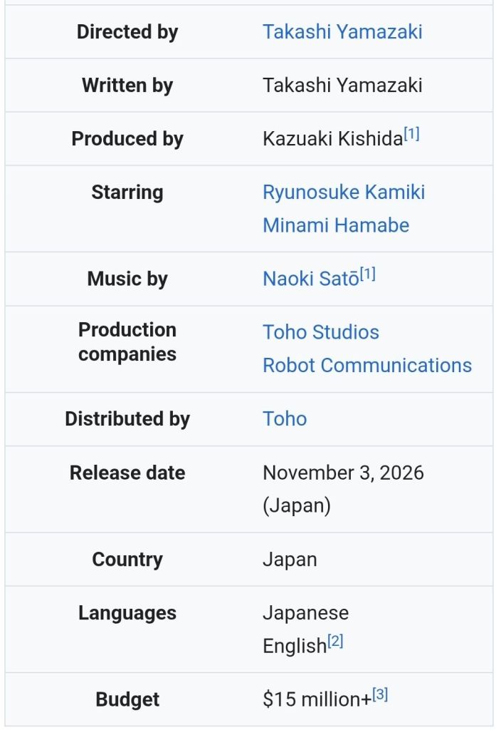 Godzilla Minus Zero – November 06, 2026 by TAKASHI YAMAZAKI, sequel to Godzilla Minus One (2023)