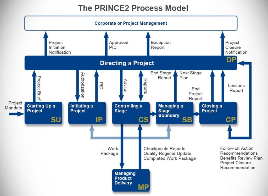The diagram typically visualises the project lifecycle from a “Project Mandate” to “Project Closure” through these processes: