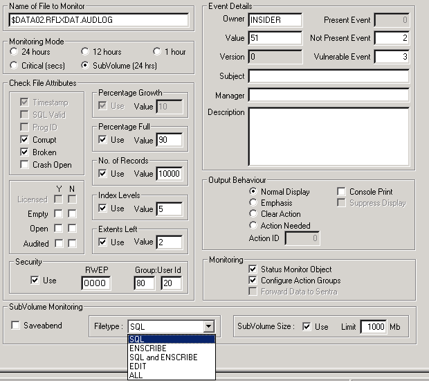 I have project managed all Enterprise Manager integrations with the NSK based Reflex 80:20 product. One of my earlier projects involved the R&D for a development to monitor both NSK file arrivals and comprehensive file monitoring. This software covers both ENSCRIBE and SQL file metrics, e.g. percentage full, growth, corruption, security and so on. Four screenshots provided below.