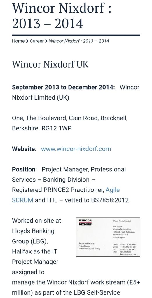 Wincor Nixdorf, One The Boulevard, Cain Road, Bracknell, Project Manager 2013 – 2014 Wincor Nixdorf, One The Boulevard, Cain Road, Bracknell, Project Manager 2013 – 2014 Share this: Share on X (Opens in new window) X Share on Facebook (Opens in new window) Facebook Share on LinkedIn (Opens in new window) LinkedIn Email a link to a friend (Opens in new window) Email Share on WhatsApp (Opens in new window) WhatsApp Share on Reddit (Opens in new window) Reddit Share on Tumblr (Opens in new window) Tumblr Share on Pinterest (Opens in new window) Pinterest Like Loading...